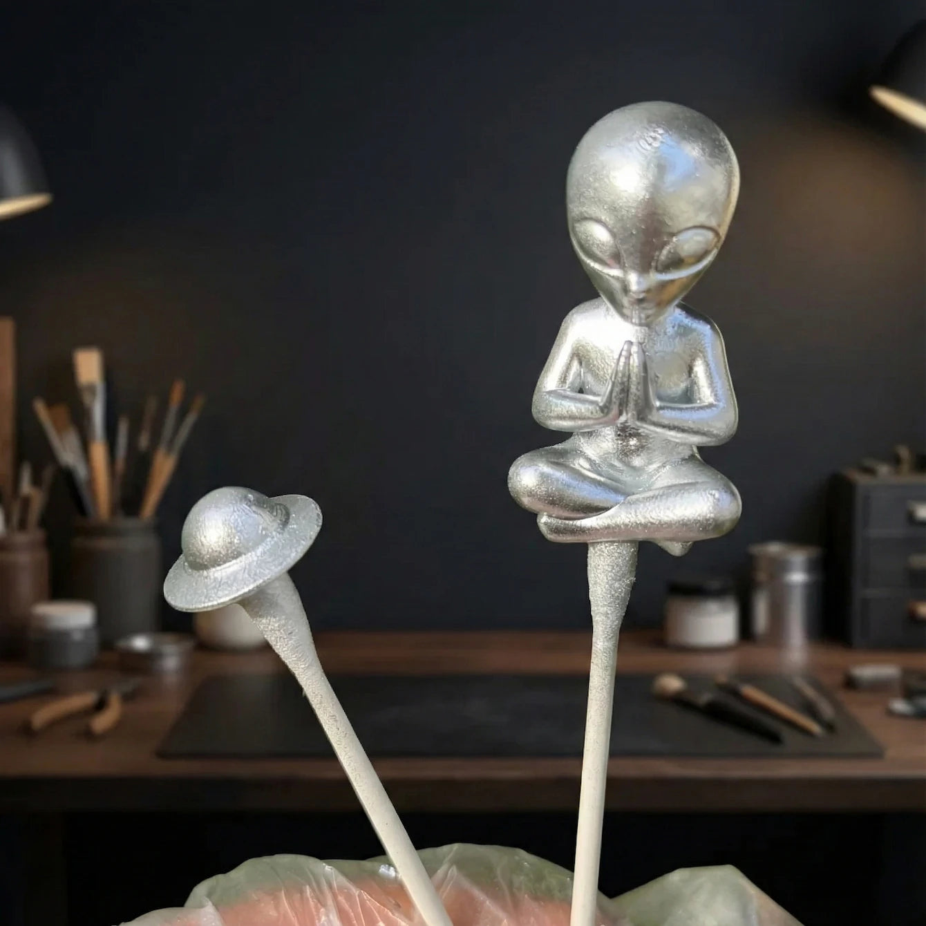 Silver ET Figurine: A meditating extraterrestrial sculpted for quiet focus.