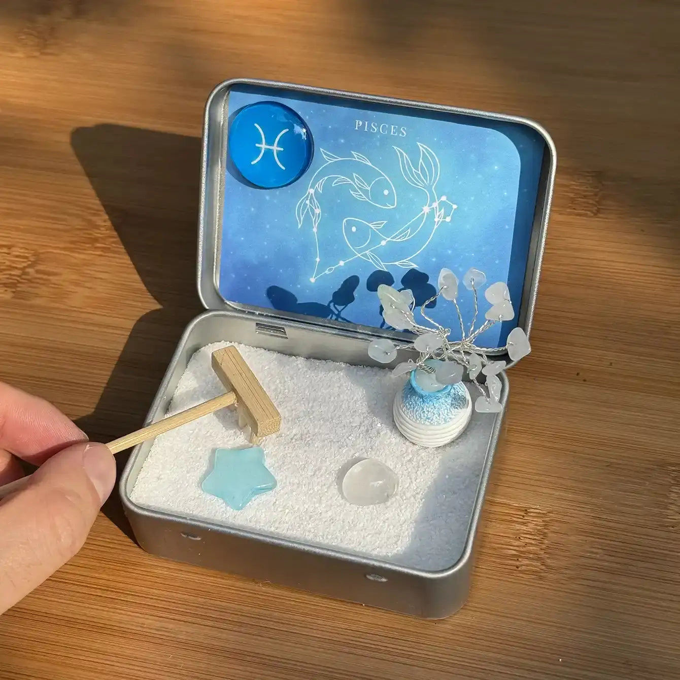 The Pisces Zen Garden includes an aquamarine crystal tree, a blue aventurine star, a clear quartz stone, fine white ocean sand, a bamboo rake, a Pisces zodiac magnet, a double-sided mindfulness card, and a compact metal tin.