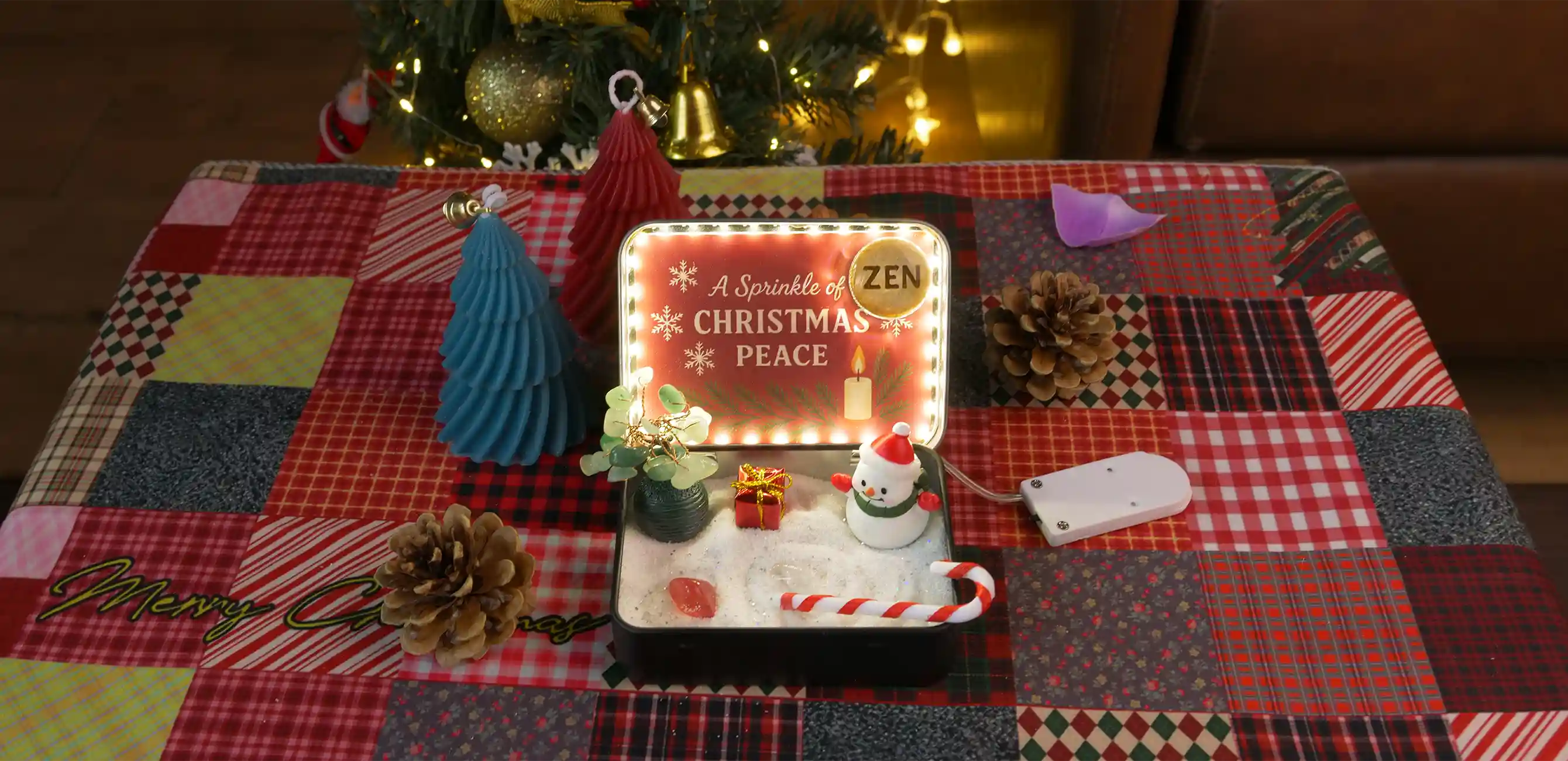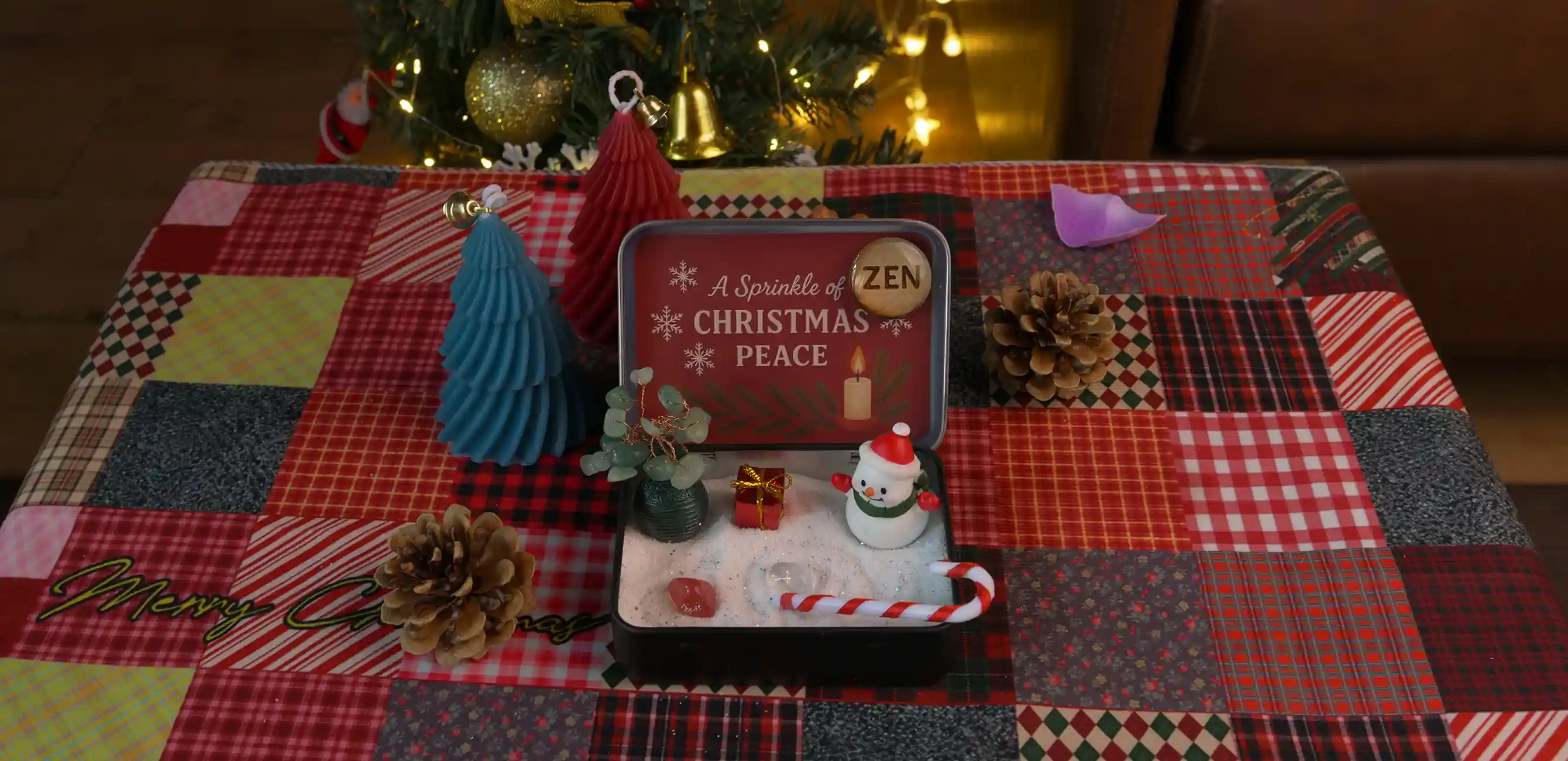 This is your festive tool for mindfulness! Instead of a traditional bamboo rake, use the miniature candy cane to trace soothing patterns in the snow-white sand. It’s a playful way to relax.
