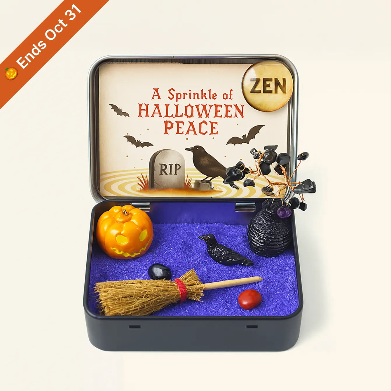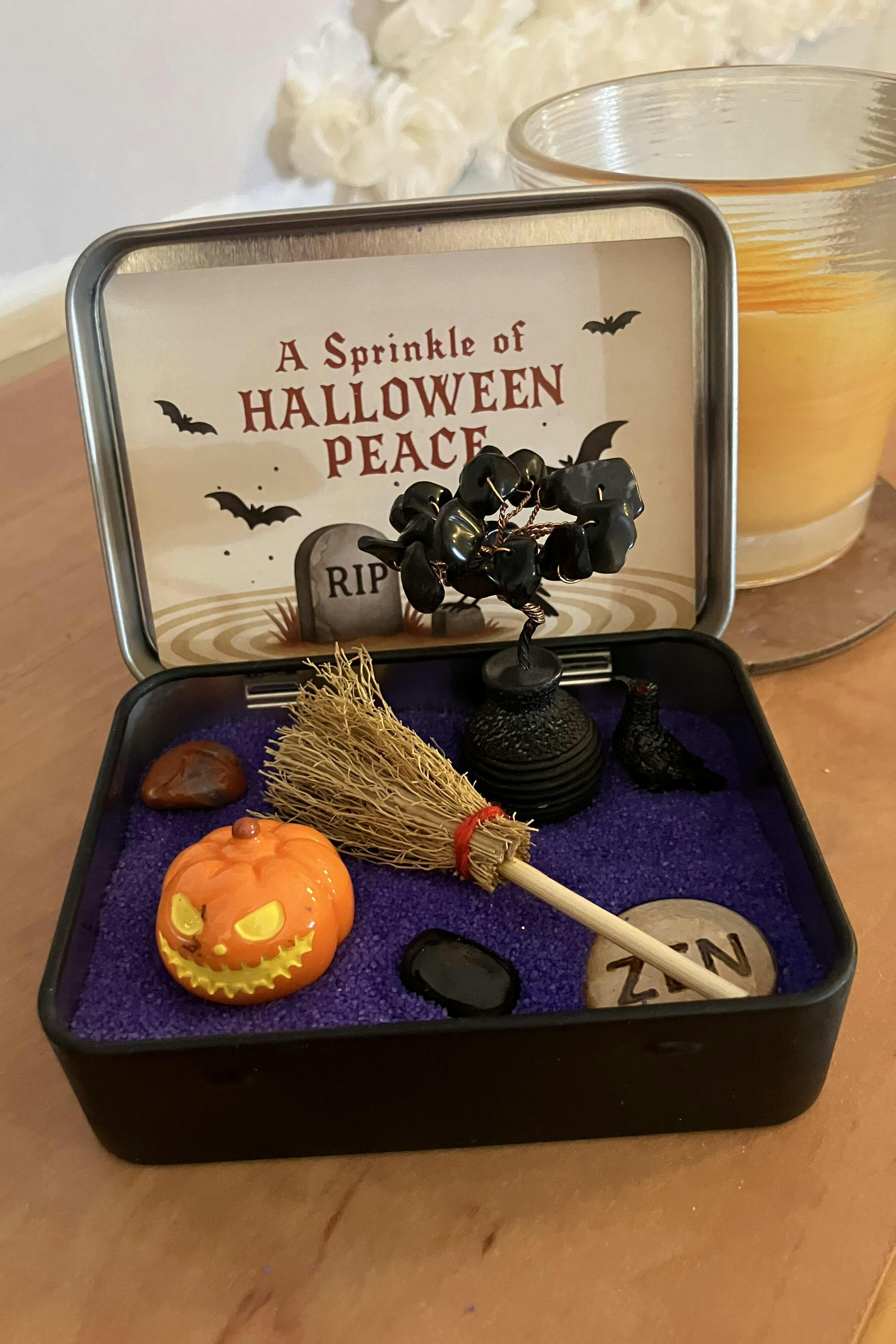This portable zen garden empowers you to create calming moments wherever you are. Handcrafted with natural crystals and Halloween accents, it brings peace and festive charm to any setting.